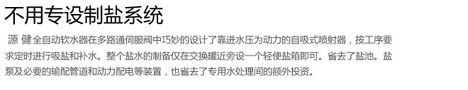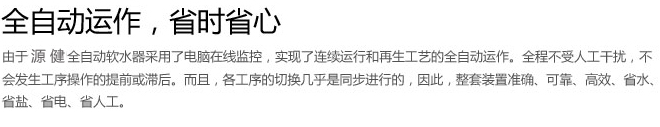 采用数字显示全自动阀门,按流量进行再生,具有自动化程度高,盐耗低等特点,是锅炉水软化、空调冷却水、化工用水、宾馆、洗衣房、生活用水、纺织行业、软化水首选设备。